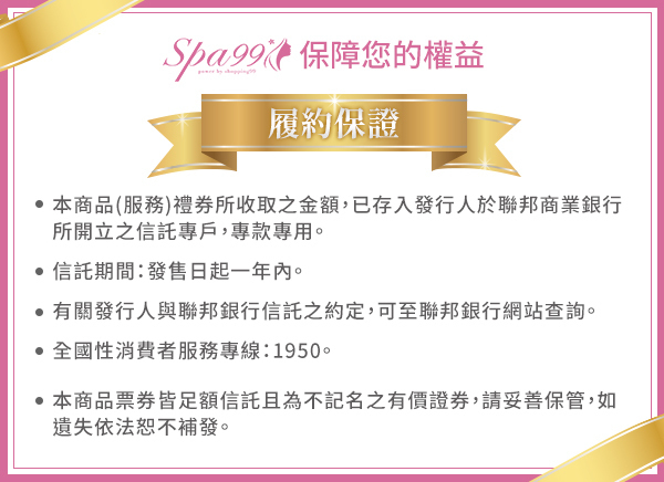 3. 請至少於預計來店日之前一週先行以電話預約,實際預約情形需依店家當天預約狀況為主,逾時15分鐘視同取消該次預約,敬請配合。恕不接受現場直接預約。到店時請務必出示Shopping99兌換券,恕不接受未持兌換券者。
