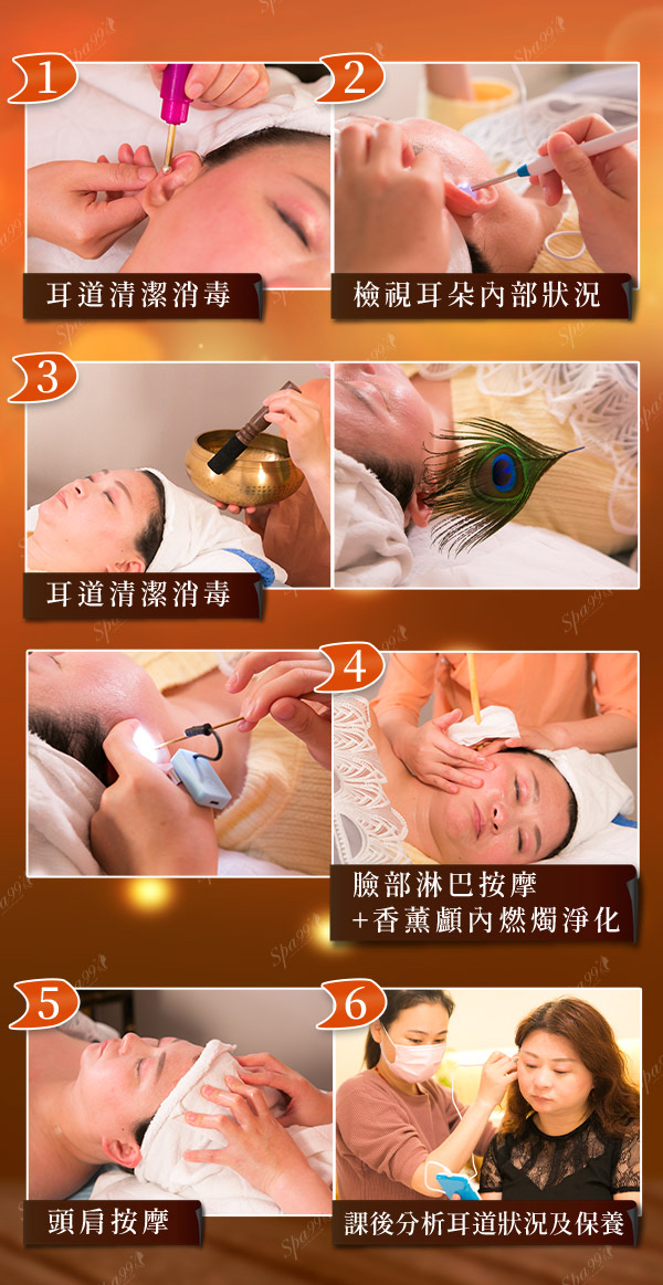 一開始采耳師會檢查耳道及解說采耳流程,之後用尼泊爾音波放鬆,孔雀翎刺激臉部顏面神經,目地聚集能量給客人安撫,接著采耳采耳完後會用燃燭將體內濕氣排除,同時也會臉部淋巴按摩,結束後還有背部按摩徹底放鬆身體的壓力,得到釋放。