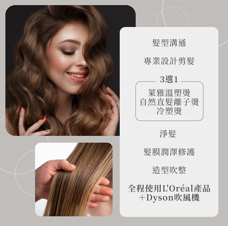 選用頂級Dyson吹風機,搭配專業吹整技巧,依照顧客毛流與髮型進行造型吹整確保髮型能夠美麗持久,不論是激情洋溢的捲髮、俐落的短髮還是優雅的長髮,皆能吹出最完美的造型。