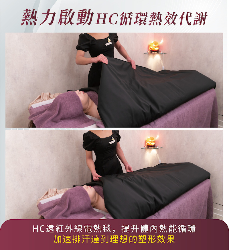 完成前面專業的手技雕塑步驟後,最後透過HC遠紅外線代謝毯,激活身體的自然排汗機制,幫助釋放體內積聚的毒素和水分,達到燃脂和代謝加速的雙重效果,讓你感受到明顯的輕盈與舒爽。