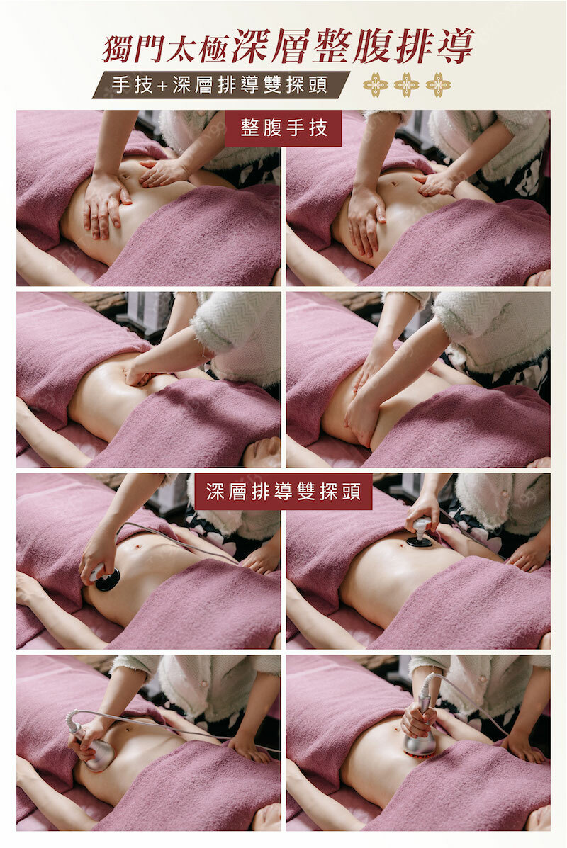 先採用太極能量手技,針對腹部穴位施作,有效舒緩長期情緒壓抑,再使用雙排導儀器加強腹部施作,局部雕塑腰部線條!