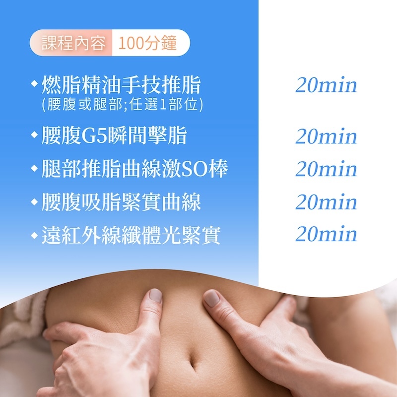 全程著重於提升局部的緊實觸感與流暢線條感,讓腰腹部位在熱感與舒壓中找回輕盈與柔軟,感受身體線條自然延伸的美好體驗。