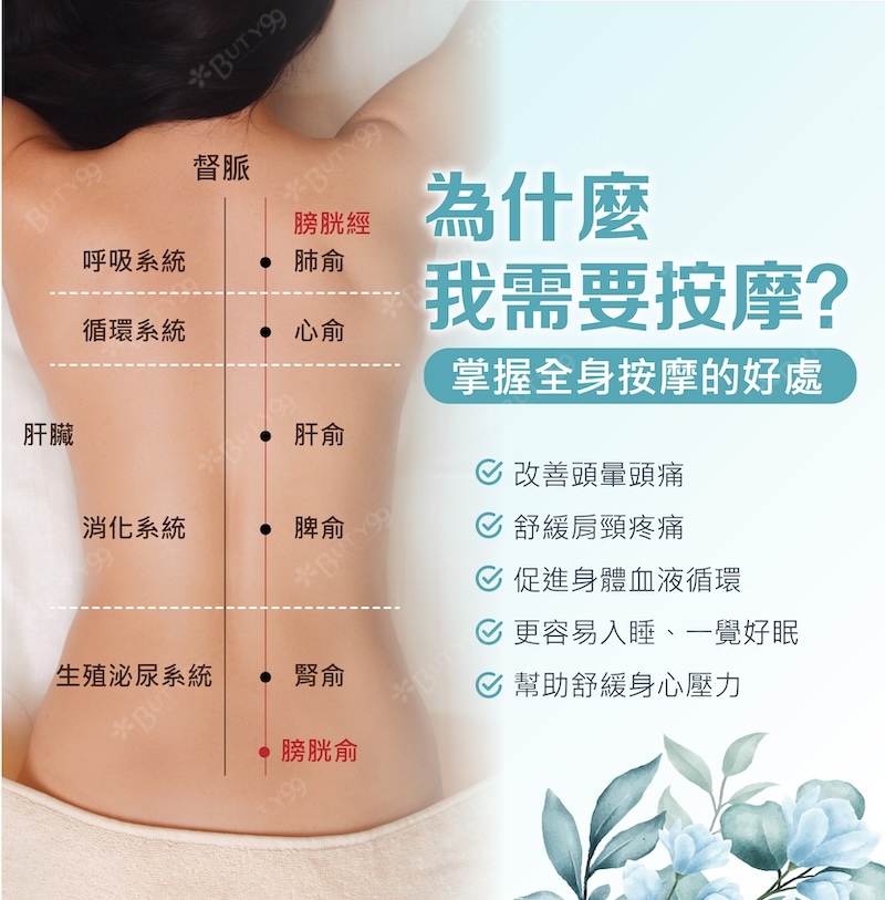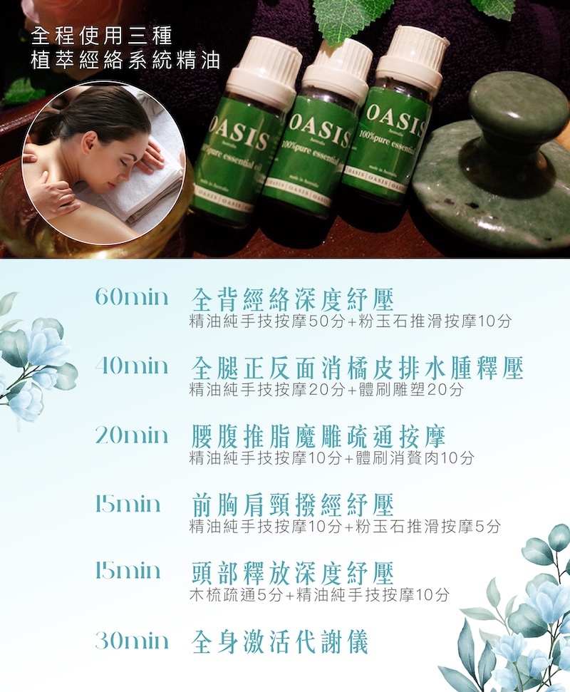 採用三款專屬精油依個人體質搭配調理,由芳療師以純手技按摩活絡背部循環、釋放緊繃,