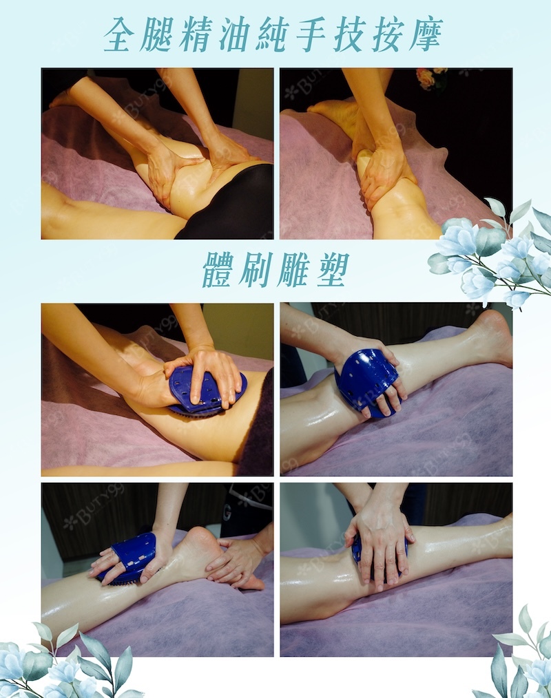 針對雙腿正反面肌群,先以精油按摩紓緩久站久坐造成的沉重與緊張,再透過體刷進行包覆式的刷滑手法,加強腿部包圍感與釋壓效果,打造視覺輕盈曲線感受。