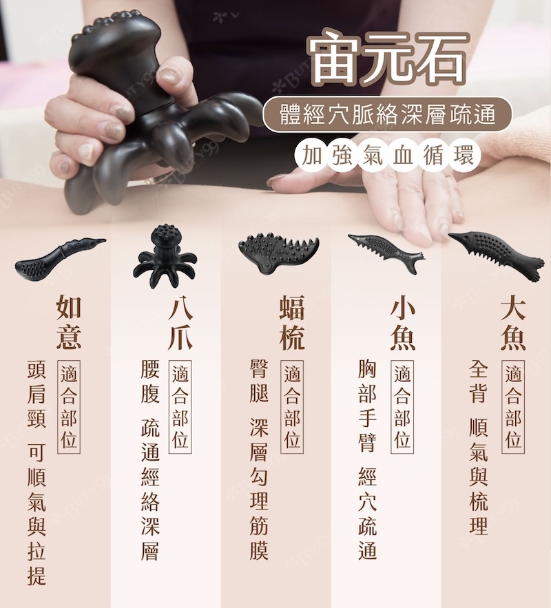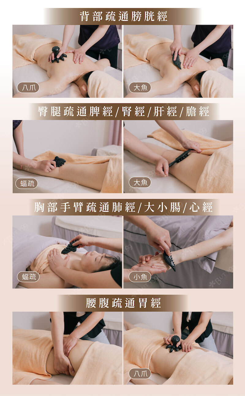 課程從背部開始,運用大魚與八爪等專業器具,針對膀胱經路線進行深層放鬆,舒展肩背緊繃感。接著延伸至臀腿部位,