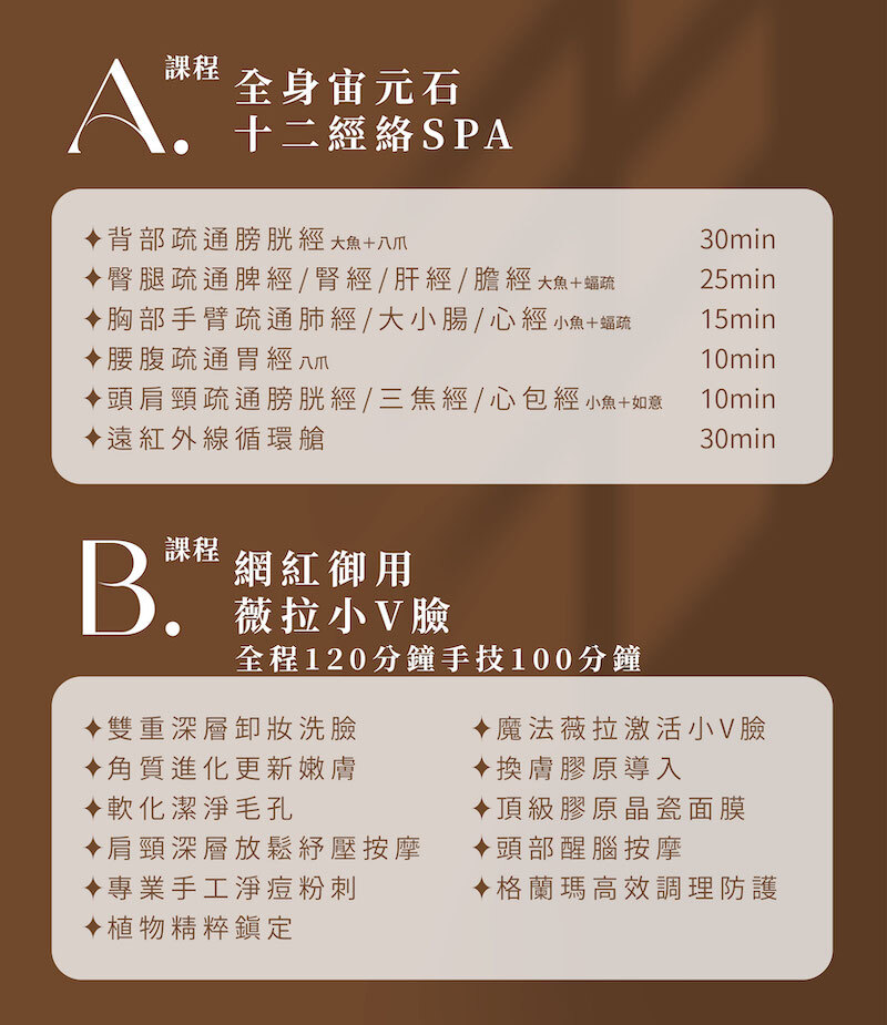 每位貴賓皆由專屬美療師全程服務,結合多年經驗手技,透過深層精油按摩搭配療癒音樂,引導體內滯留的廢物循環排出,緩解因疲勞產生的不適,從肌膚修護到身體曲線雕塑皆能兼顧。