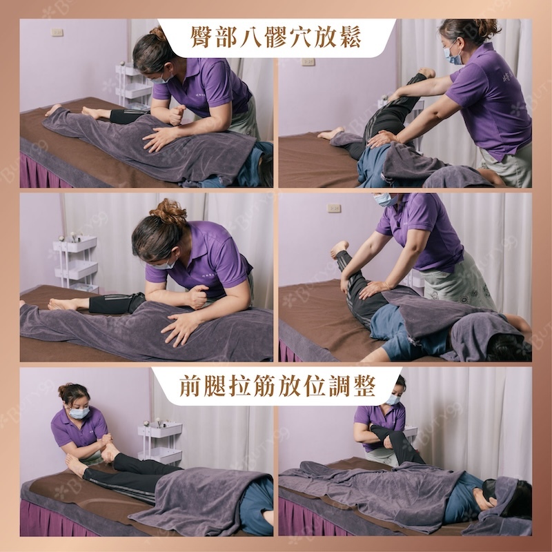 以放鬆手技針對臀部進行按壓,協助緩解久坐壓力,前側腿部舒展與調理,讓步伐更加輕盈順暢。