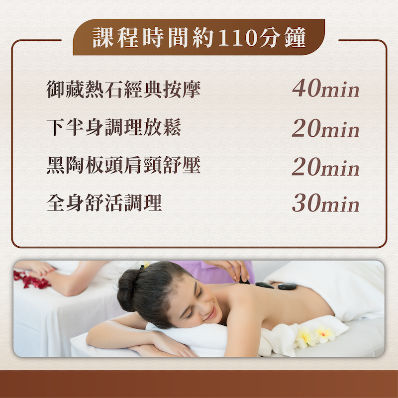 利用溫熱能量石結合舒緩手技,推按全身重點肌群,藉由熱感帶來放鬆舒適,幫助釋放壓力,打造深度放鬆的愉悅體驗~