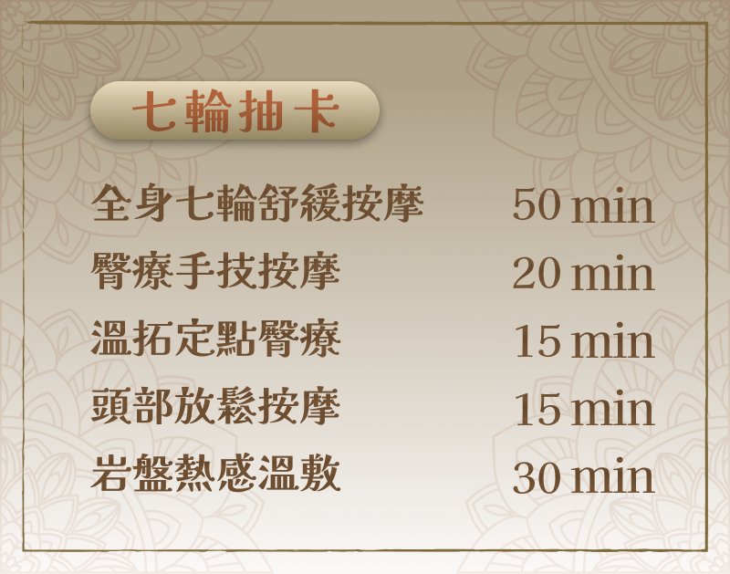 結尾以岩盤熱感包覆身體,讓溫熱感逐漸傳遞,舒緩緊繃肌肉,沉浸溫暖與平衡的放鬆體驗。