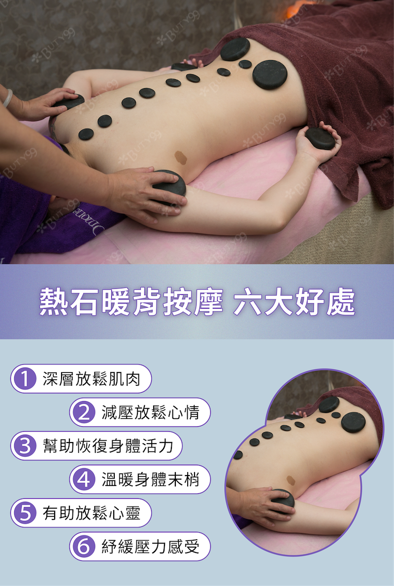 透過熱石暖背療程,利用溫熱能量深入肌群,協助放鬆僵硬的背部肌肉,促進循環與舒展,讓緊繃逐漸釋放,恢復溫暖放鬆的舒適感。
